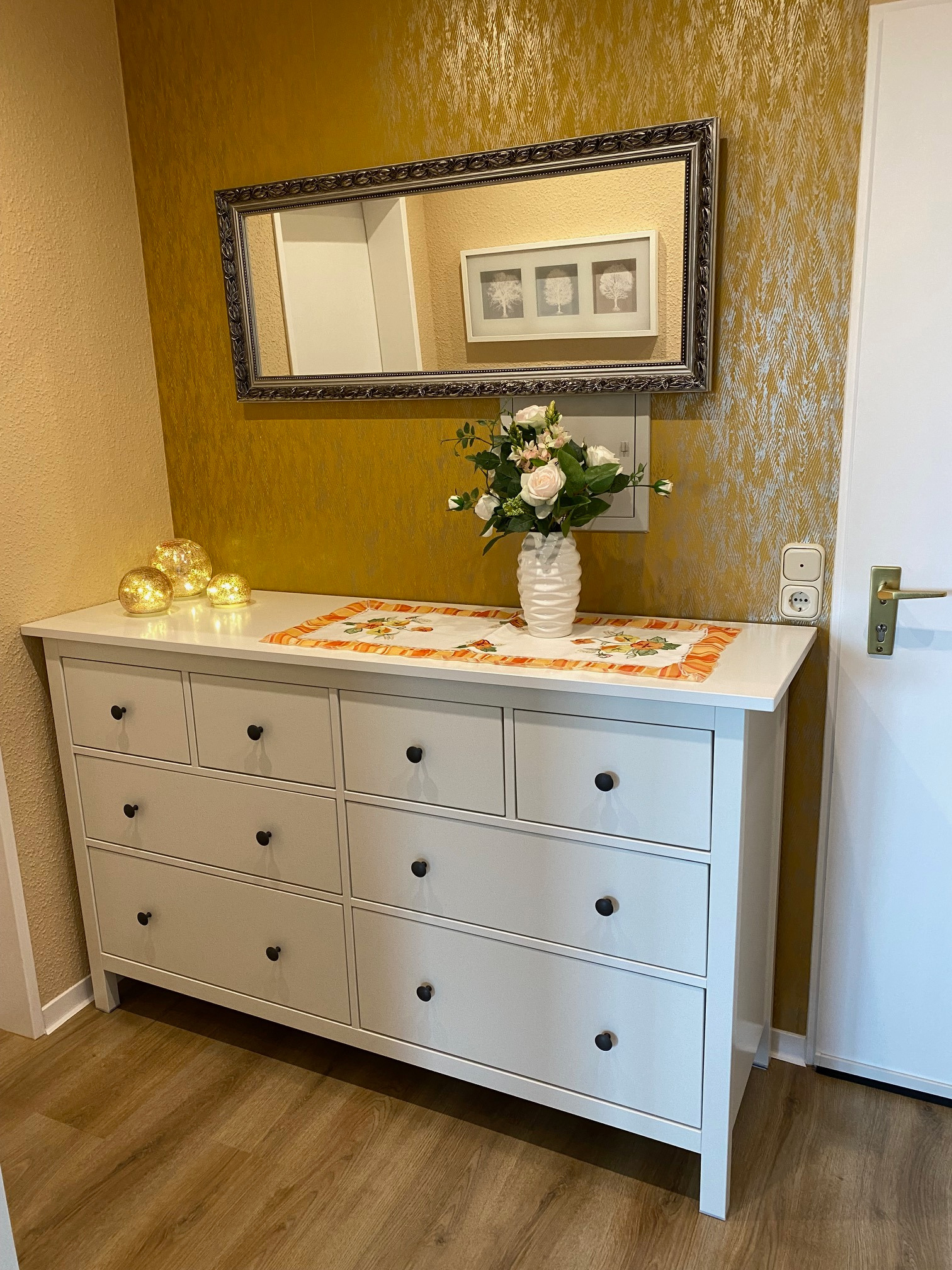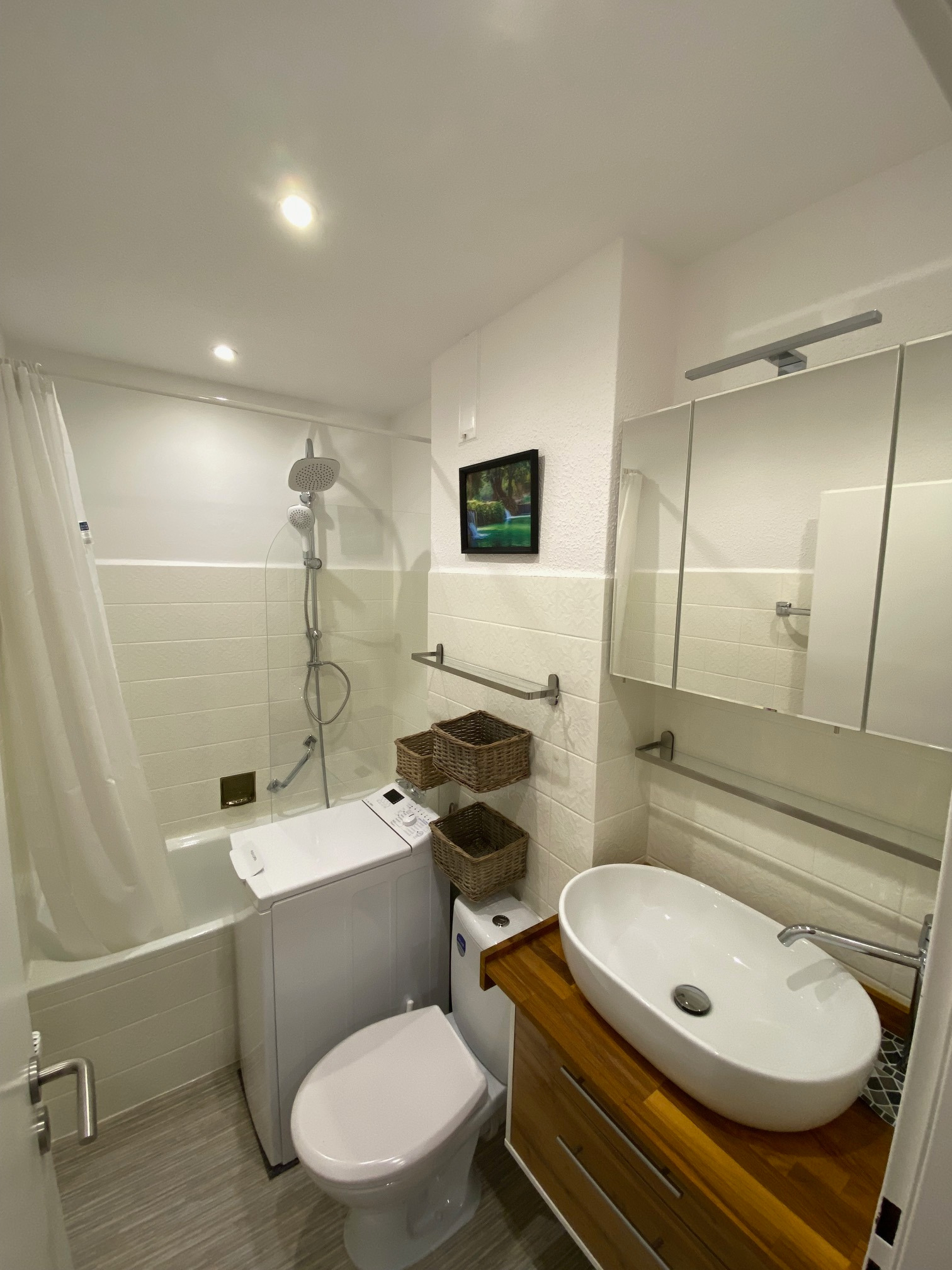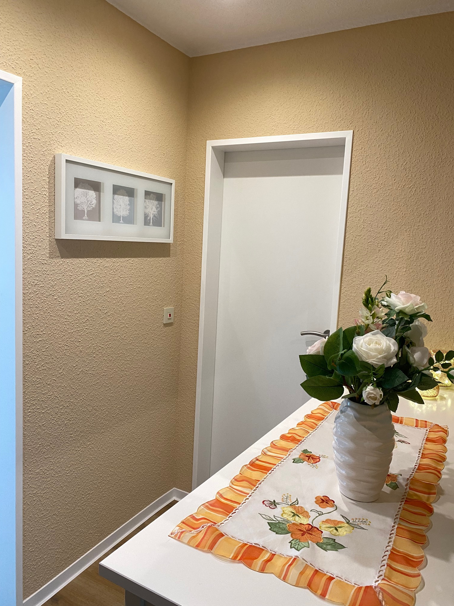 Im hell gefliesten Wannenbad befindet sich die Waschmaschine/Toplader. Der Flur ist mit einer Kommode, Spiegel, Schuhkipper und