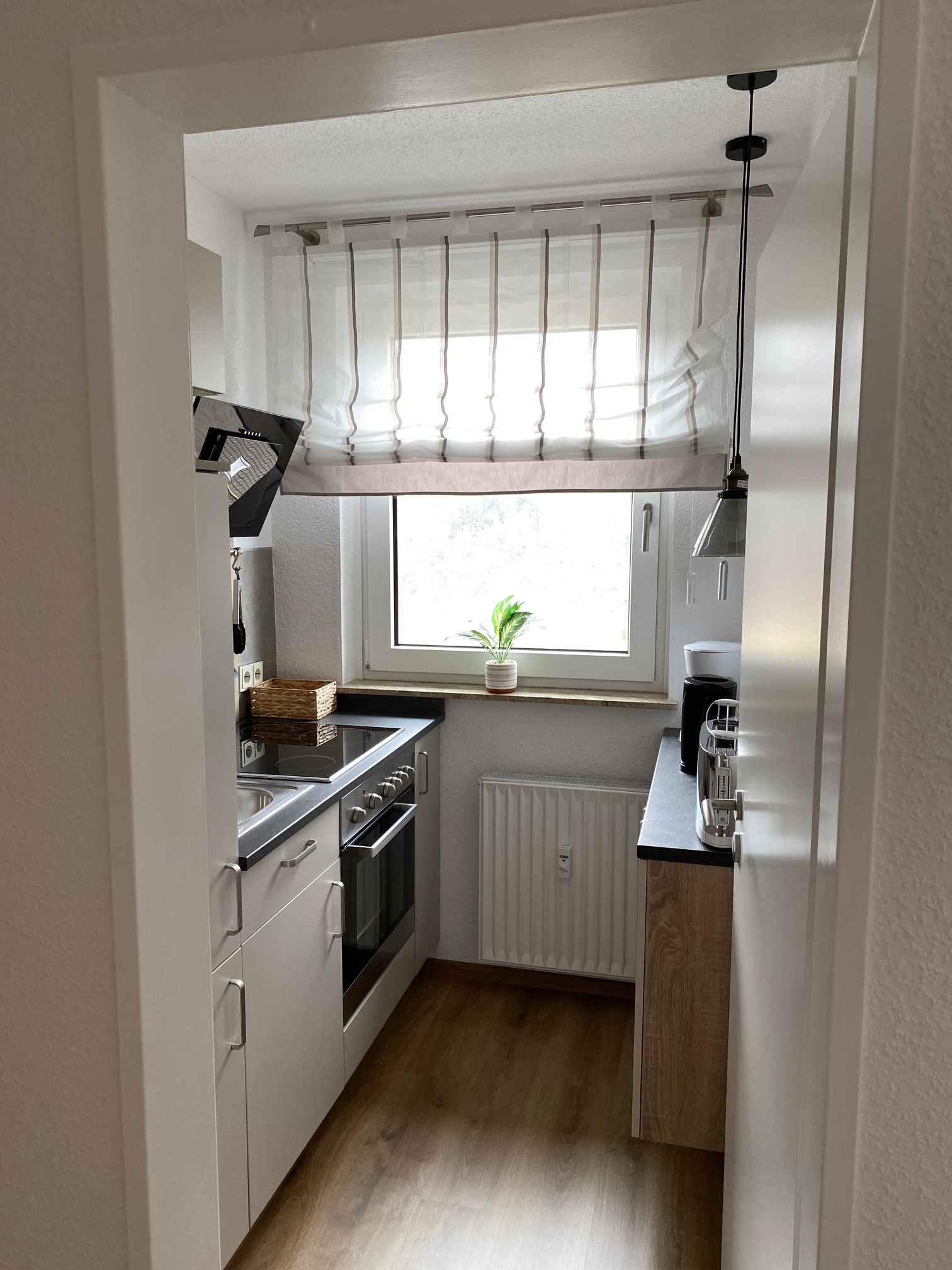 Die Küche verfügt über eine vollausgestattete Küchenzeile mit Ceranfeldkochplatten und Backofen sowie Kühlschrank und Spüle.