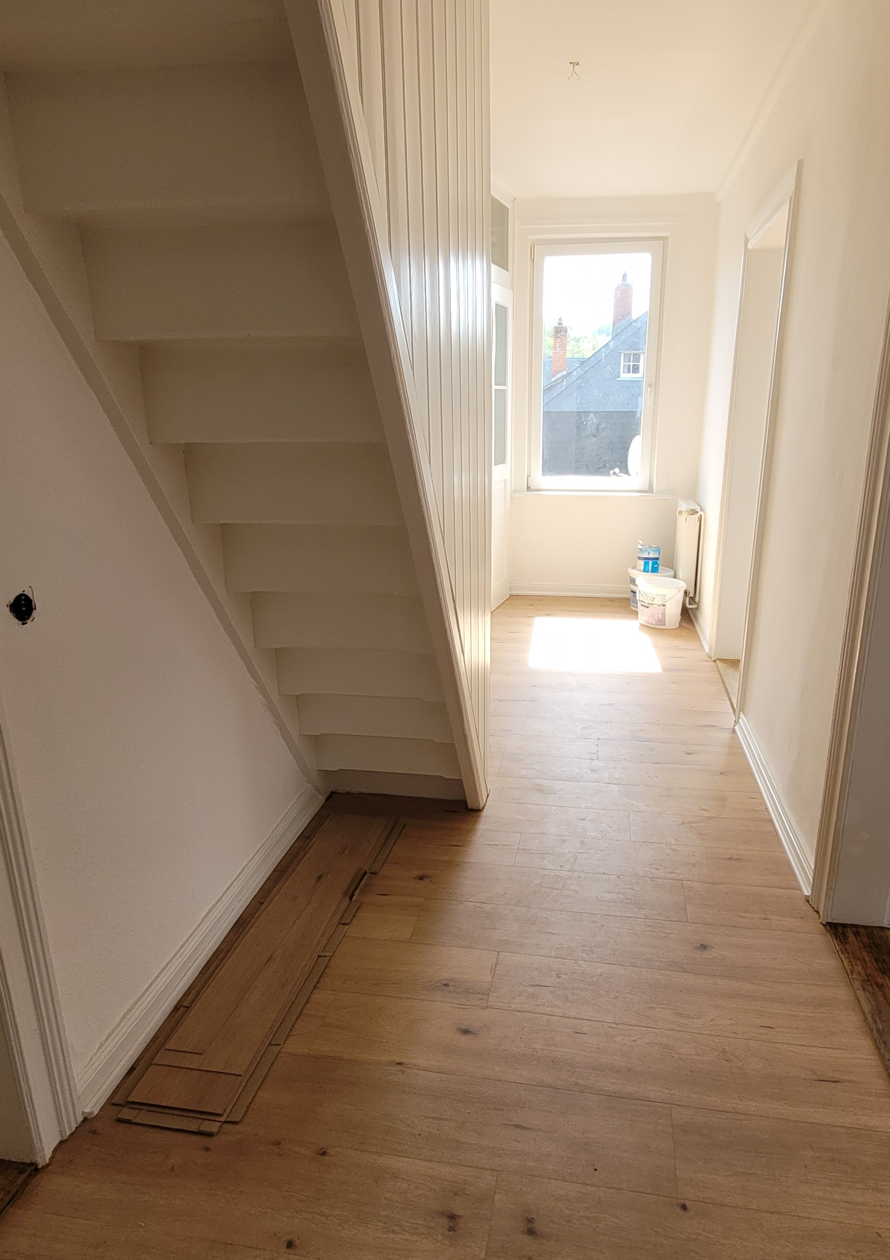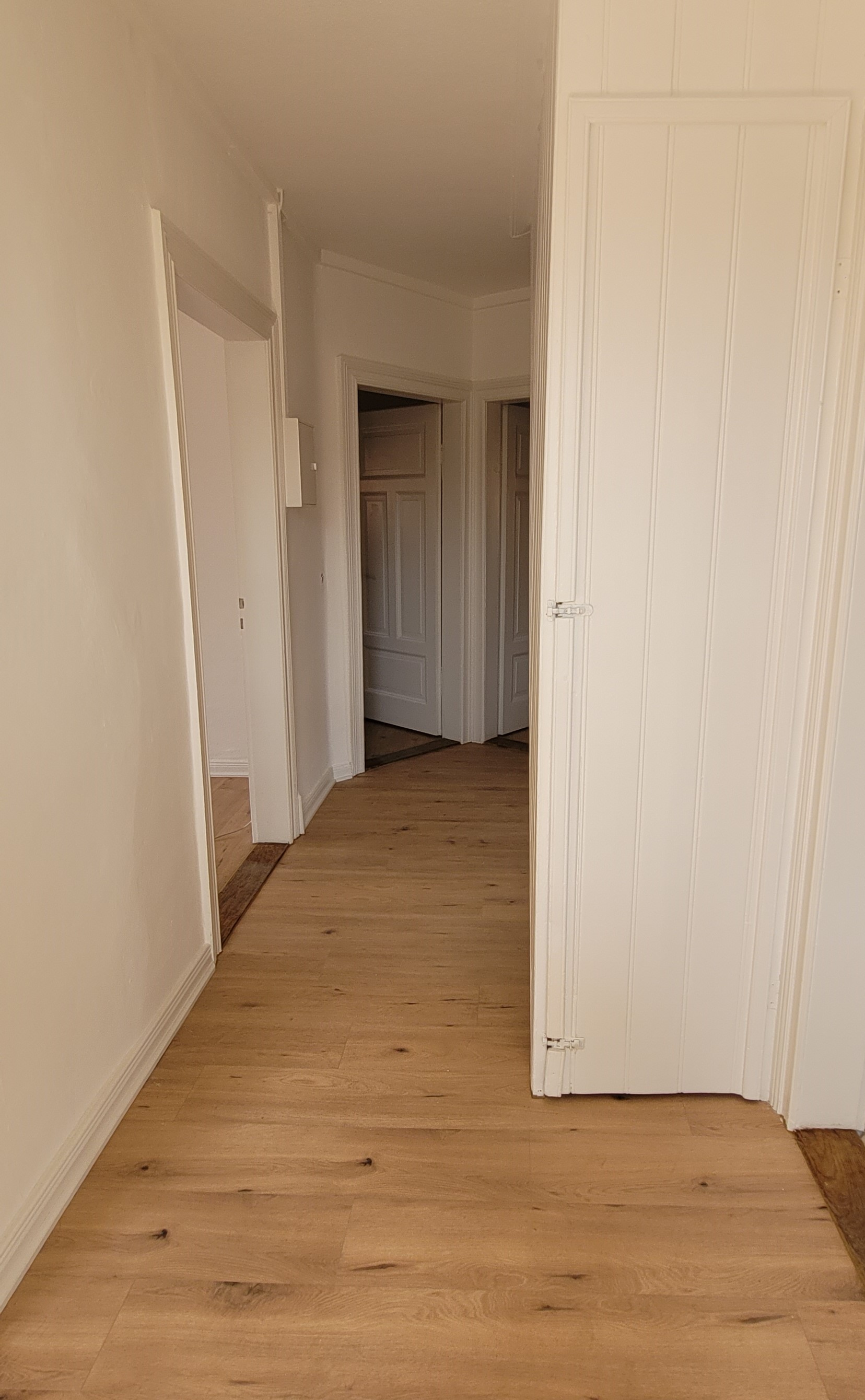 Die Wohnung wird weiß gestrichen und mit neuem Vinylbelag übergeben.